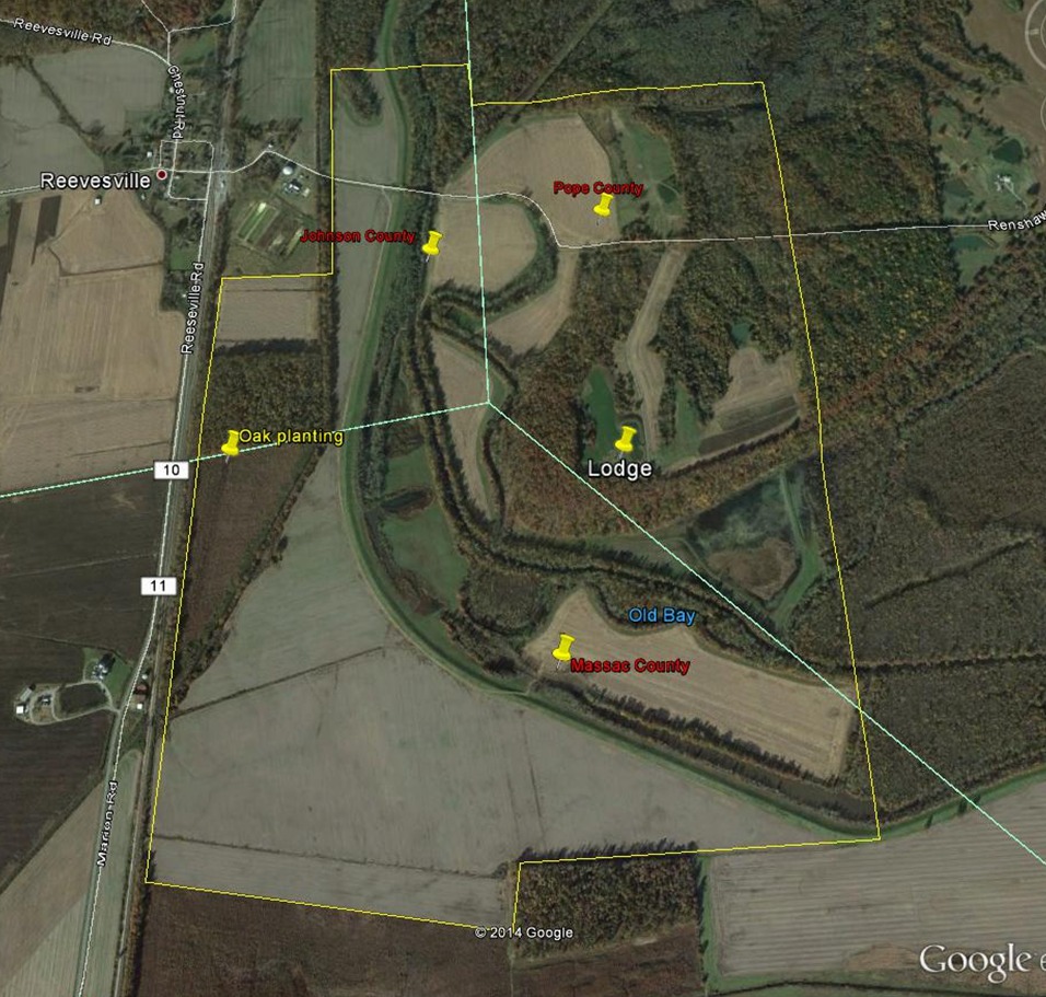 Features of the grounds include crop fields, old woods, regenerating woods, waterway, wetlands, and a limestone cliff.