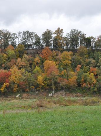 This field is in the old Ohio River bed. Wildlife has access to the limestone bluff, trees, and the wetland.