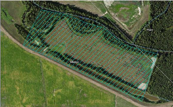 * Property crosshatched in blue. Reevesville Levee (easement) runs west to east. Large 'borrow pit' filled with water, inside levee, along southern border. Spann's property to the east.